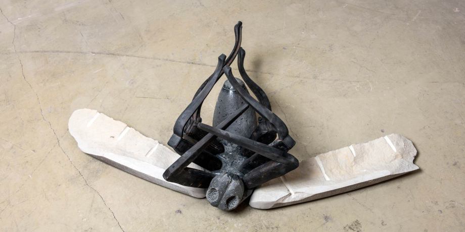 Peer Steppe bearbeitet schwere irische Kalksteinbrocken, Granit und Basaltlava, fügt auch Einzelskulpturen zu neuen Formen zusammen, assoziativ zu überdimensionierten Panzern von Käfern, Insekten und